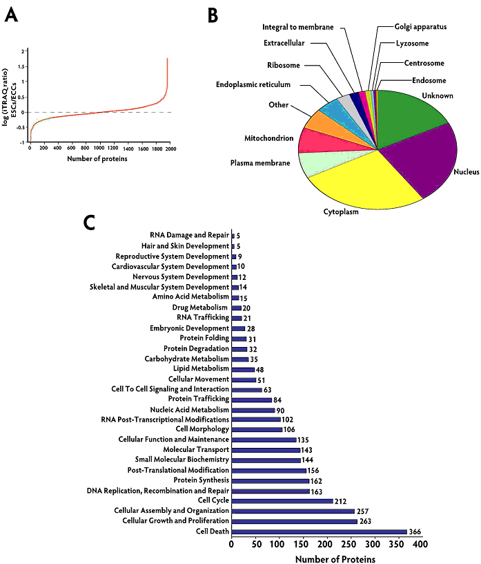 Localization and functional annotation of proteins identified from ESCs and ECCs. Panel A shows the distribution of iTRAQ fold changes (proteins expression levels) observed between ESCs and ECCs. Panel B shows the gene ontology analysis for cellular localization of all the proteins identified. Primary and alternate localization data was downloaded from human protein reference database (www.hprd.org) and Panel C shows functional classification of all the proteins quantitated in this study. Using Ingenuity pathway analysis tool, proteins justifying specific biological function significantly (p <0.05) are listed. |
